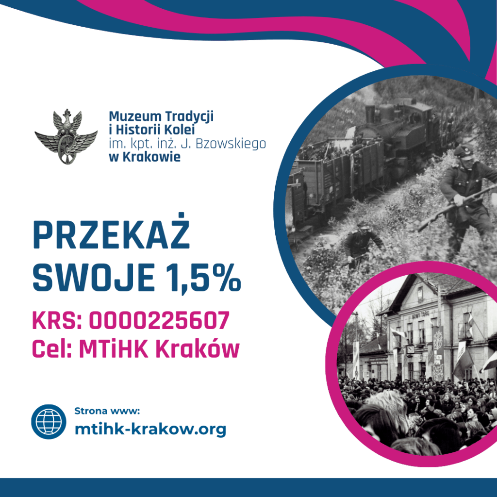 Jak w poprzednim roku, w związku z realizacją celów statutowych takich jak: podejmowanie działań mających na celu ochronę zabytków, pamiątek historycznych i innych materiałów związanych z kolejnictwem oraz podtrzymywanie tradycji Polskich Kolei Państwowych, jednostek wojsk kolejowych WP, oraz innych formacji mundurowych i organizacji, Stowarzyszenie Miłośników Kolei w Krakowie zachęca do przekazania swojego 1,5% podatku na rzecz powstającego Muzeum Tradycji i Historii Kolei im. kpt. inż. Jerzego Bzowskiego w Krakowie.
